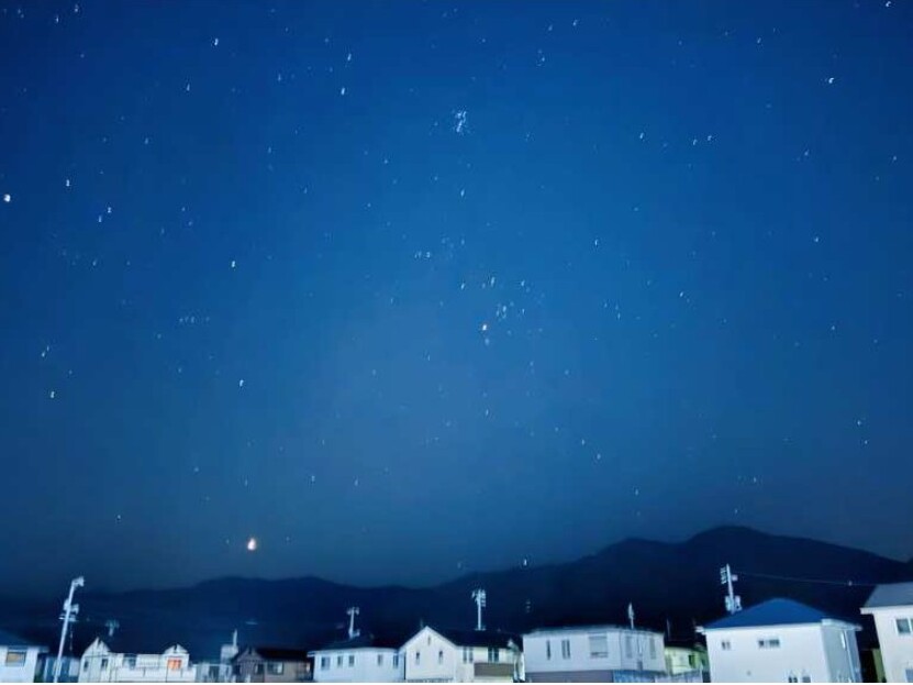 【夜間工事】7月末から盆休みまで夜間工事の現場支援に入りました。深夜になると星空がきれいに見え、iPhoneによる撮影を試みたところ、意外ときれいに写りました。工事ではバルーンライトを設置して作業を行い、その明るさにつられてカブトムシが飛んできました。健康に気を付けながら頑張ります。(土木N・K)