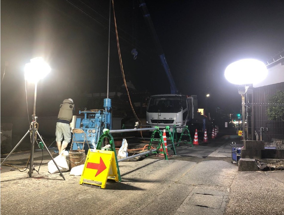 薬液注入工まで完了】ケーシング立坑築造工事を先行実施し、坑口部上流・下流における薬液注入工を実施してきました。薬液注入工は、今後実施予定である推進工事(地中を推し進め、下水道管を設置する工事)に際し、地下水湧出を抑制することを目的としています。推進工事開始までの準備が整ってきました。(土木S・S)