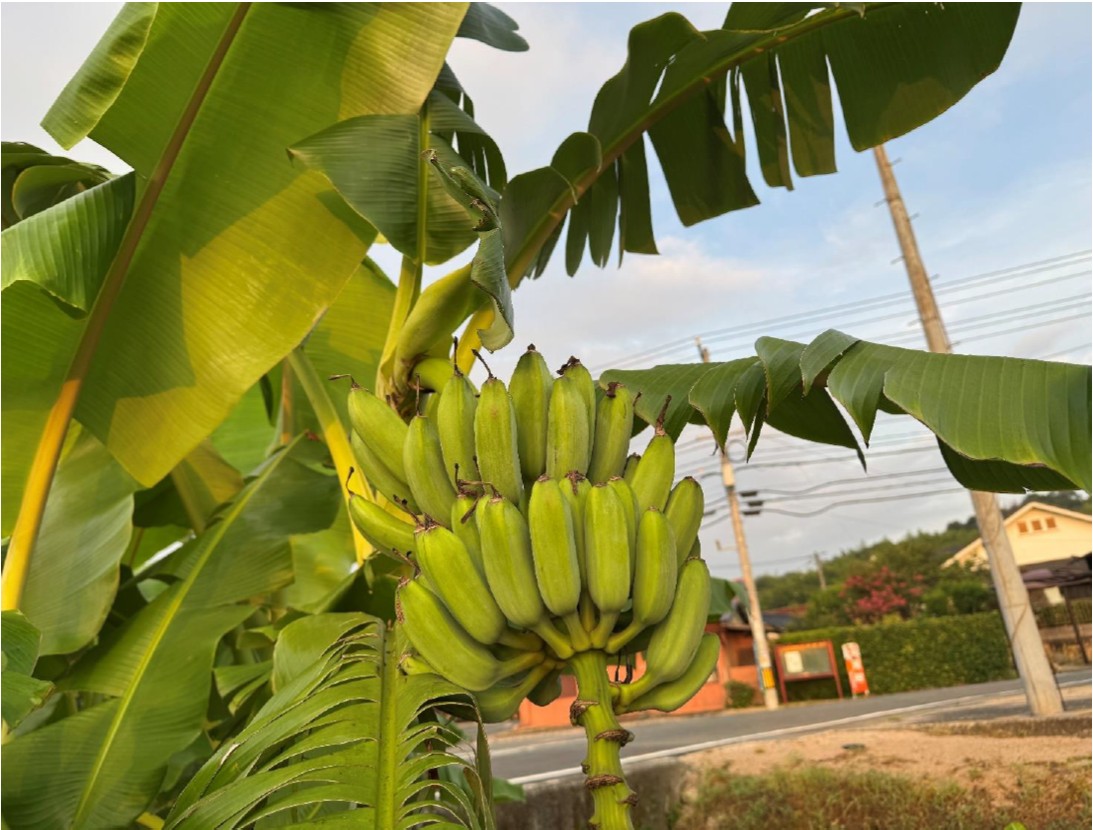 念願の・・・栽培開始から3年、ついにバナナらしくなりました。一昨年に苗を1 本植え、大きく育ったものの冬には枯れてしまいました。翌年は新芽が出て花も咲きましたが、開花が遅く枯れてしまいました。今年は八月末現在順調に育っています。そろそろ収穫して追熟させてみようと思います。(土木A・T)