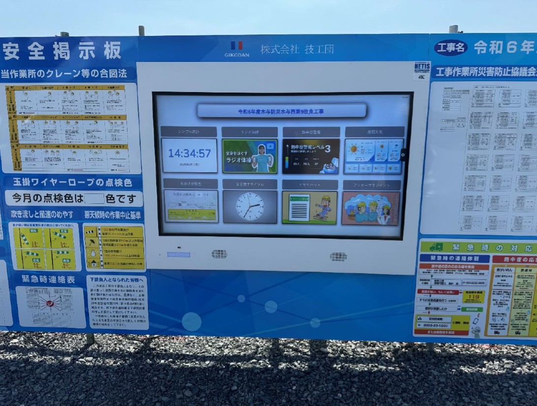 【デジタルサイネージ木与西9において、デジタルサイネージを設置しました。安全意識の向上、作業工程の共有、近隣住民への情報提供、緊急時の警告表示などを、リアルタイムかつ多言語対応により効率的な運用が実現します。今後も、安全や生産性向上、地域貢献のために新技術にも積極的にチャレンジします。(土木K・N)