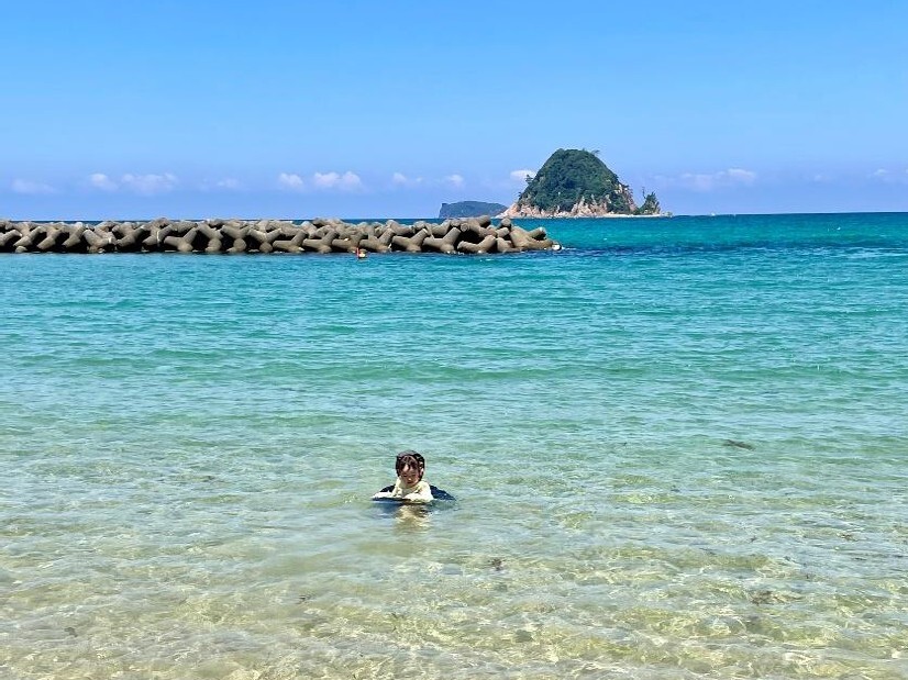 海水浴デビュー娘も大きくなり、初めて海水浴に行きました。現在、阿武町で仕事をしていることもあり清ヶ浜海水浴場を選びました。これまで車で付近を通過したり、海岸の清掃活動に参加したことはありましたが、海水浴は今回が初めてです。日頃の清掃活動のおかげで砂浜はきれいでした。(土木R・N)