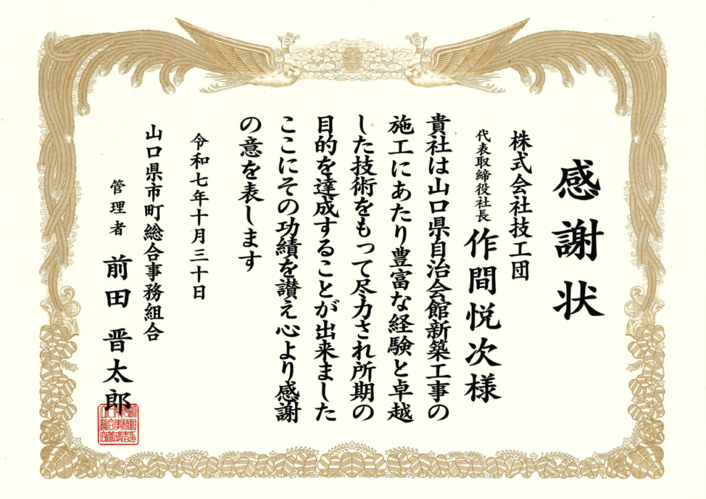JVとして参加した「山口県自治会館新築工事」に対して、感謝状をいただきました。