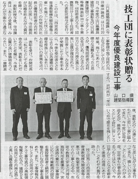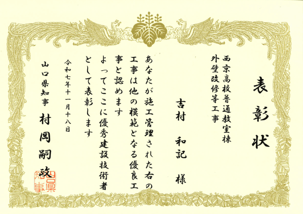 山口県より、「西京高校普通教室棟外壁改修等工事」において優良工事表彰をいただきました。