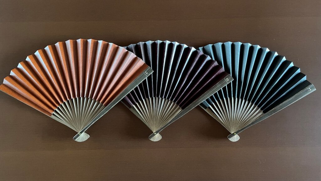 【創業80周年記念品】周年記念品に10年前から京都・白竹堂さんの『渋扇』を採用しています。左がこのたび2026年の80周年のモノで、色は『素』と書いてありまして、素は言わば初心を表すかなと選んでみました。初心を忘れずに取り組んでいこうといったところでしょうか。(営業E・S)