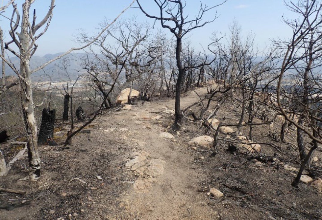 【山林火災からの再生】日本各地で山火事の発生が報じられていますが、セミナーパーク裏の山林火災から、1 年半が経過しました。越冬を2 回経験し、昨年の猛暑を乗り越えた現在の状況を確認するため、縦走登山に出かけました。草が生える気配は見られませんが、樹種によっては根元から新芽が芽吹いています。(建築M・M)
