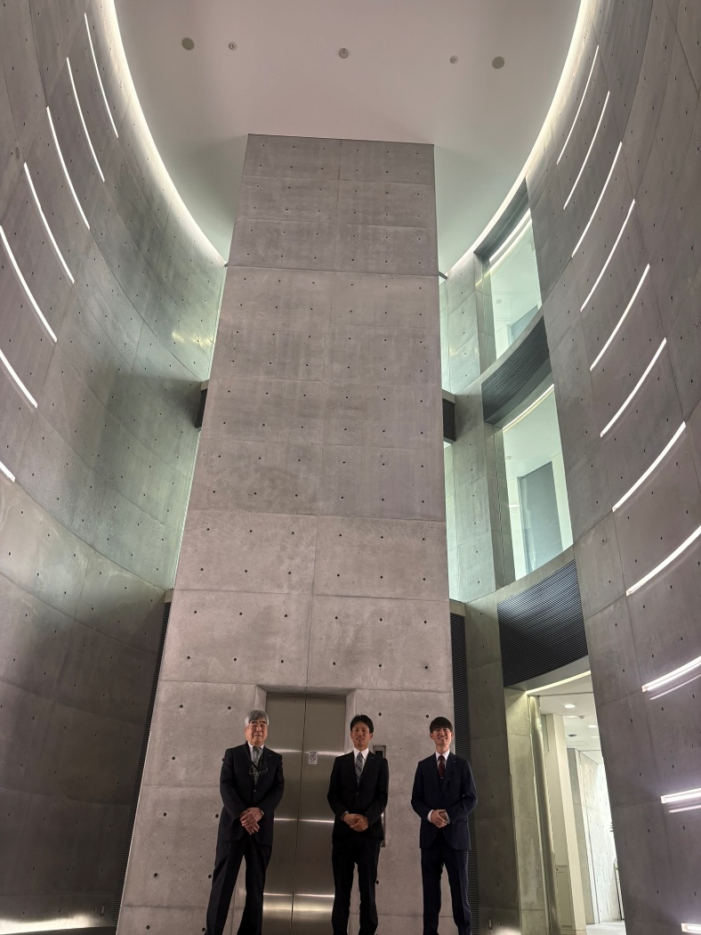 3月18日、DAIKEN様の音環境ラボを訪問した際、せっかく岡山に来たのだからと、建築家安藤忠雄氏が手がけた「おかやま信金内山下スクエア」を見学してきました。外から見ても存在感のある建物でしたが、中に入った瞬間、その世界観に引き込まれました。コンクリートの質感や光の入り方が美しく、歩いているだけで気持ちが引き締まるような空間です。中でも印象的だったのが、吹き抜けのエレベーターホールです。吹き抜け空間は迫力があり、現場での調整の大変さが容易に想像できました。飛び込みで伺ったにもかかわらず、案内係の方が丁寧に説明してくださり、こちらの質問にも数多く答えていただきました。施工監理の立場から見ると、あれほど複雑で、しかも失敗が許されない建物をまとめ上げた現場の方々のご苦労は計り知れません。どのような思いで最後までやり遂げたのか、いつか直接お話を伺ってみたいと思うほどでした。今回の見学を通じて、建築とそれを支える技術の大切さを改めて実感しました。(建築部 T・M)